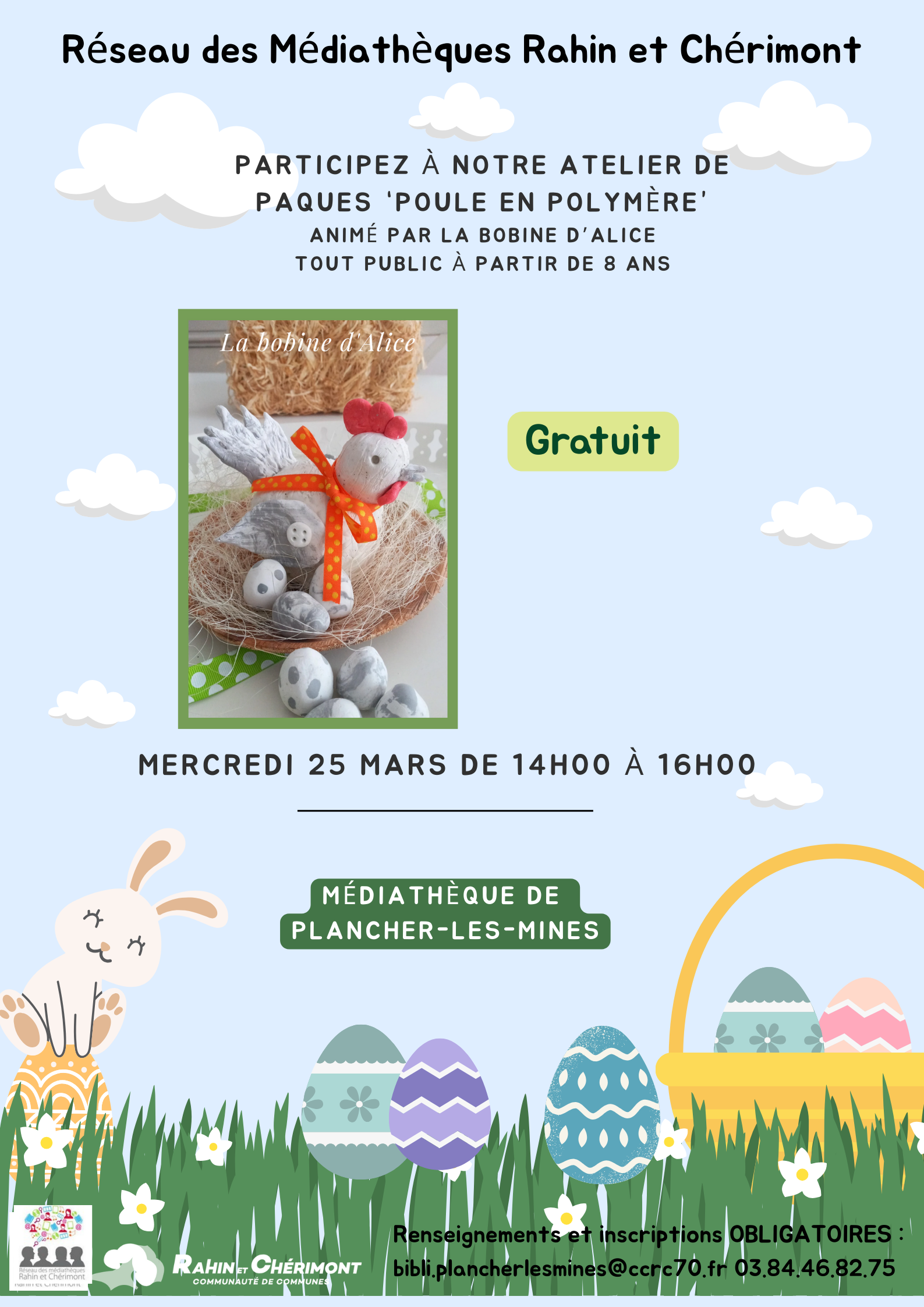 La médiathèque de Plancher-les-Mines propose un atelier "Poule en polymère", mercredi 25 février de 14h à 16h, animé par La Bobine d'Alice
