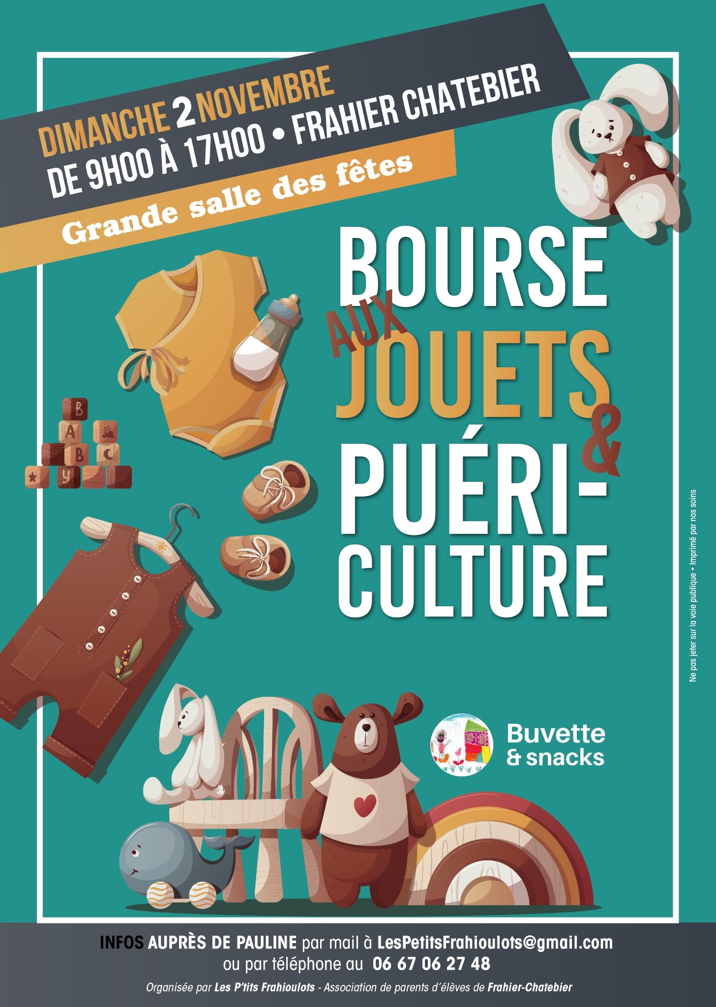L'association Les P'tis Frahioulots organise une bourse aux jouets et puériculture le dimanche 2 novembre de 9h à 17h, à la grande salle des fêtes de Frahier.