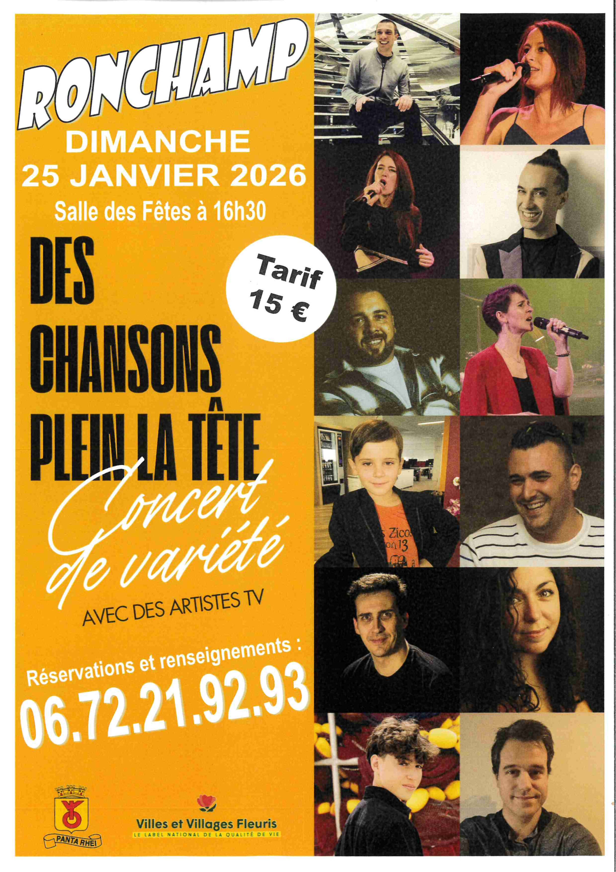 Concert de variété " Des chansons plein la tête", avec des artistes TV. Dimanche 25 janvier à 16h30 à la salle des fêtes de Ronchamp.