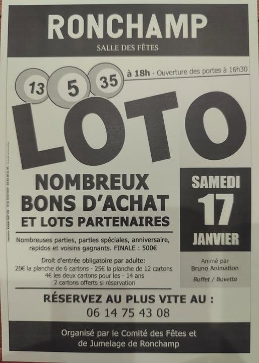 Le Comité des Fêtes et de Jumelage de Ronchamp organise un loto, à la salle des fêtes de Ronchamp, samedi 17 janvier.