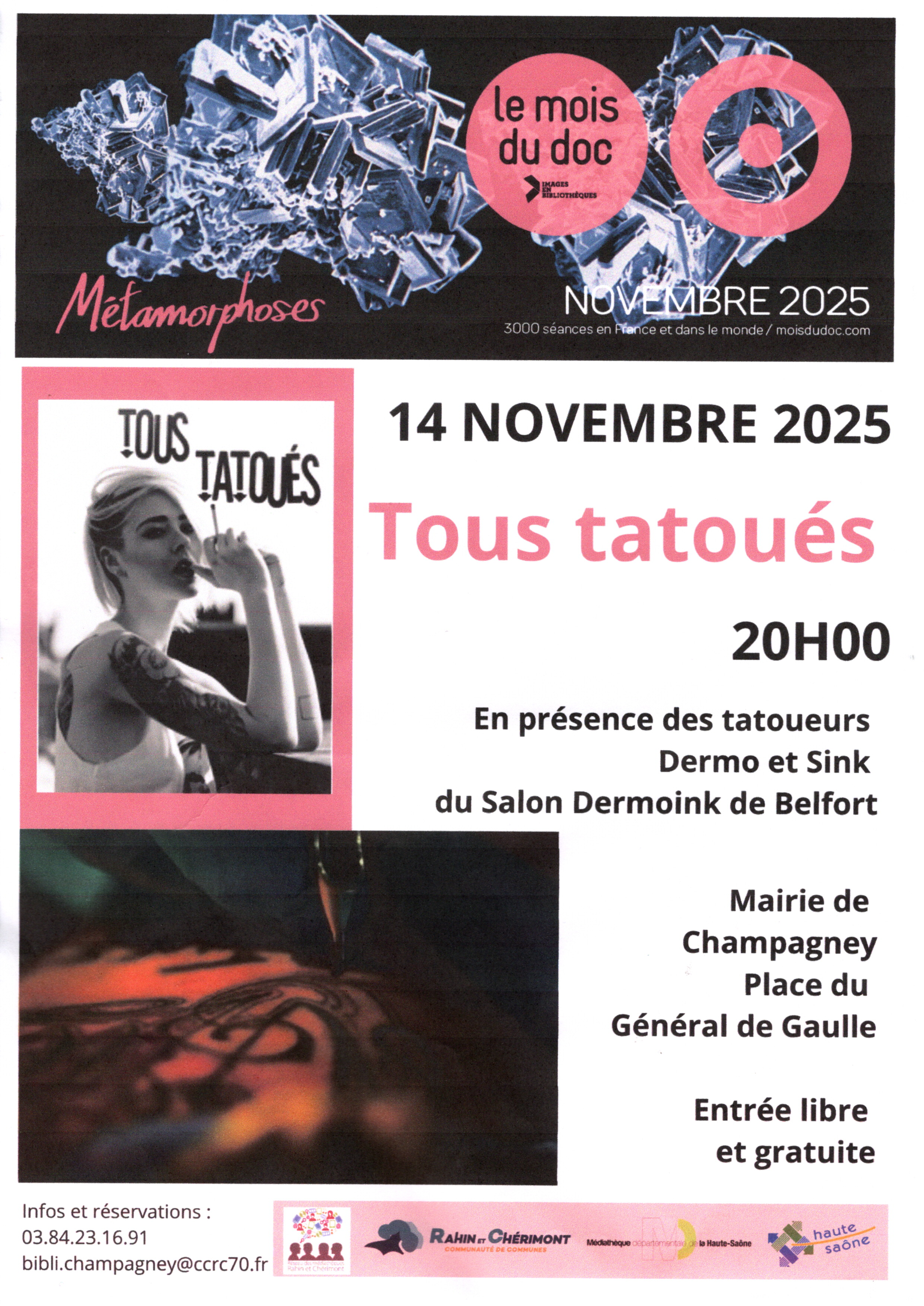 Dans ce contexte, la médiathèque de Champagney, du réseau de médiathèques Rahin et Chérimont, a choisi de vous présenter le 14 novembre 2025, à 20h00, à la Mairie de Champagney, le film "Tous tatoués" de Marc-Aurèle Vecchione (2013) -durée 55mn-