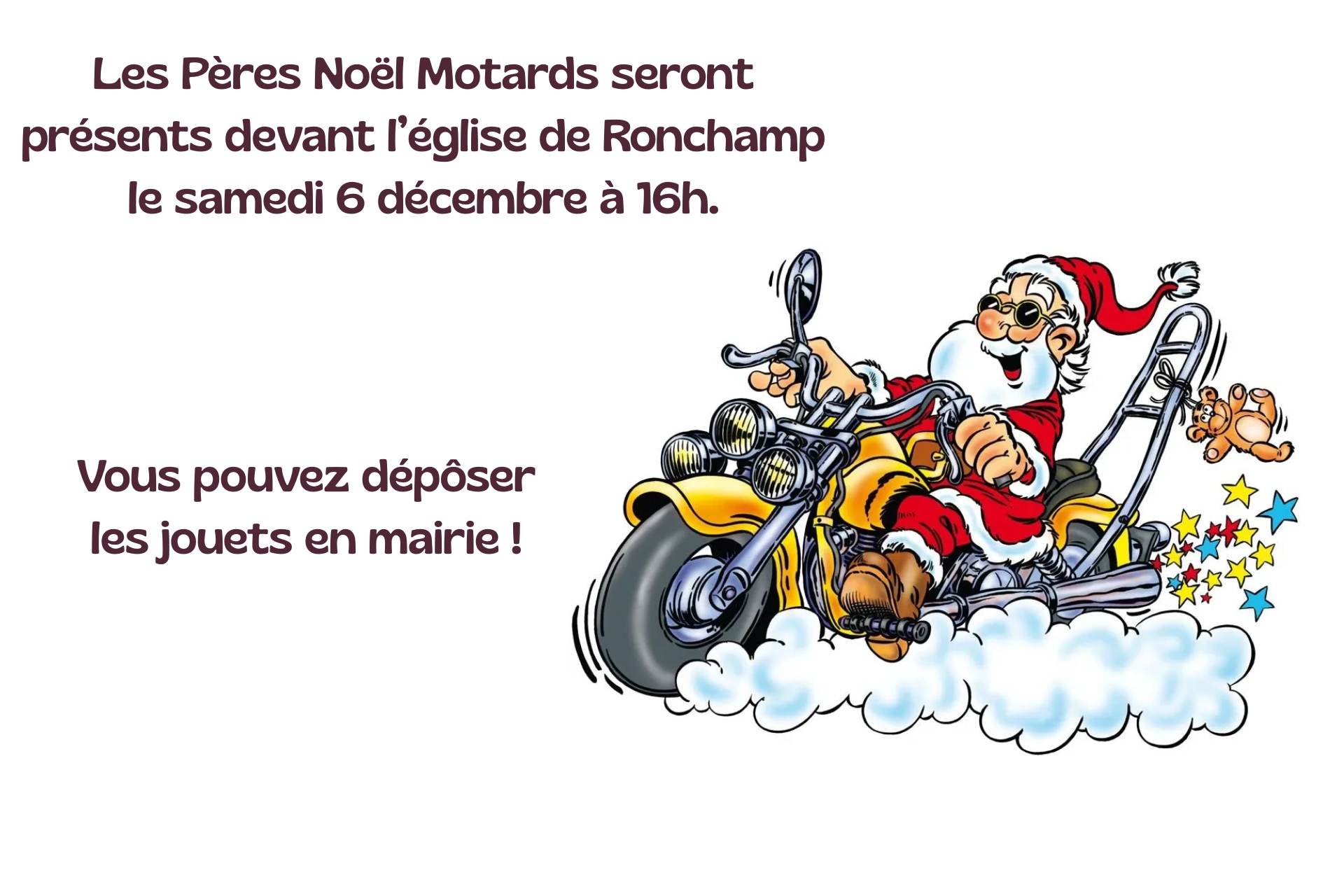 Les Pères Noël Motards seront présents devant l'église de Ronchamp, le samedi 6 décembre à 16h. Vous pouvez déposer vos jouets en mairie.